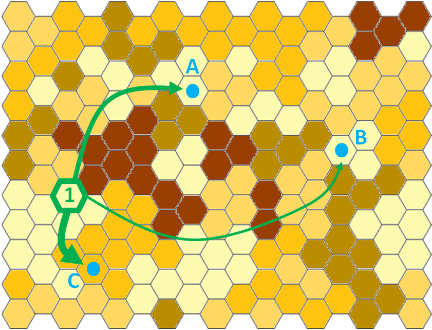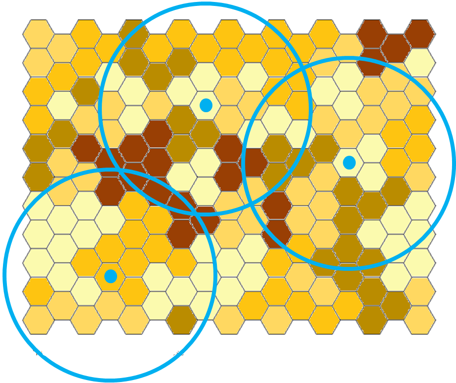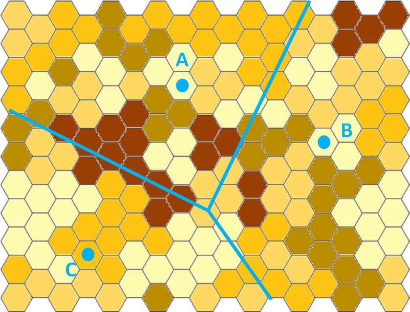 This is illustrated below in figure 1. The hexagon shapes represent some type of geography, such as postcode sectors (UK), Germeinde (Germany) or Communes (France). In each piece of geography, there is a demand (potential) for the product, usually expressed as an annual expected number of sales or annual demand for service. In our case, the level of demand is related to the shading; light yellow – small demand, dark brown – high demand. The Blue dots are the locations of dealers A, B and C. In this simple example, we should assume that this area represents the country, and that there are 3 dealers in the network.